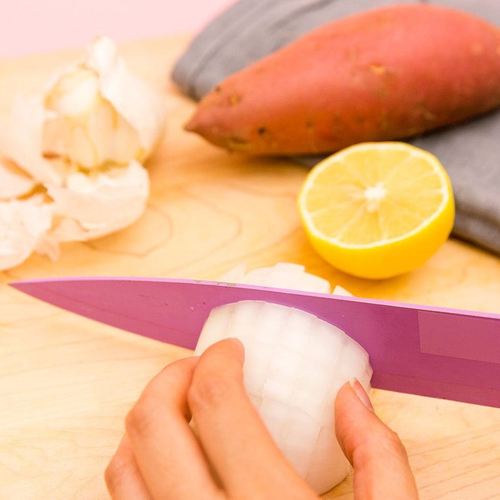 Peel sweet potatoes and chop into cubes. Dice onion and mince garlic. Juice lemon. Set aside.