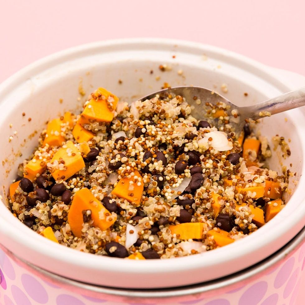 2. Rinse quinoa and add to slow cooker. Drain and rinse black beans. Add black beans, sweet potato, onion, garlic, and lemon juice.